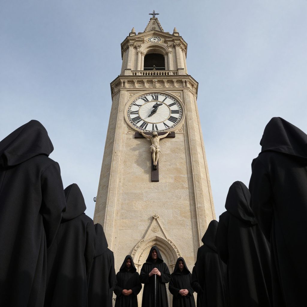 A timeless clock tower stands defiantly against the sky, its massive Roman numeral faces adorned with a crucifixion scene, while cloaked figures gather solemnly below, their postures suggesting a ritualistic reverence for the enigmatic structure.