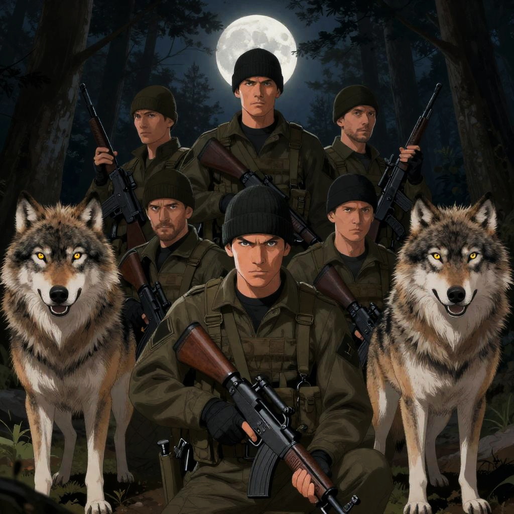 Illustration of six men in military gear with beanie hats, surrounded by two snarling wolves. Men hold guns and rifles. One man in foreground holds rifle with intense expression. Forest background at night with full moon. Wolf on left and right. Central man with intense expression. Three men in front, three in background. Wolves' fur detailed. Men's faces show determination. Dark, forested landscape.