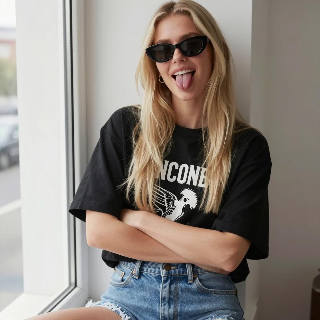 Photograph of a blonde woman with long hair, wearing sunglasses, a black oversized shirt, white graphic tee, and blue denim shorts. She is sitting against a window, tongue playfully sticking out. Background includes part of the window with . Her arms are crossed over her stomach. Bright, indoor lighting.