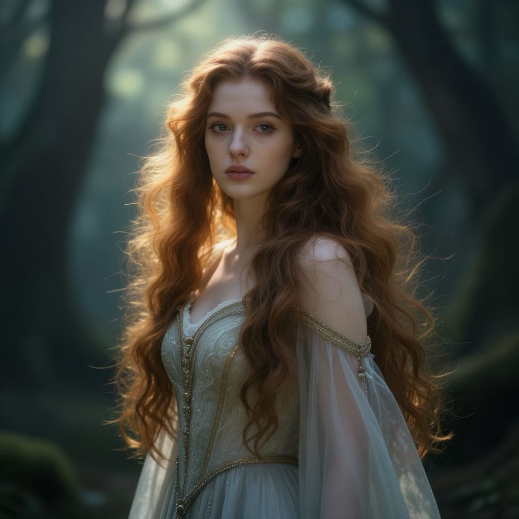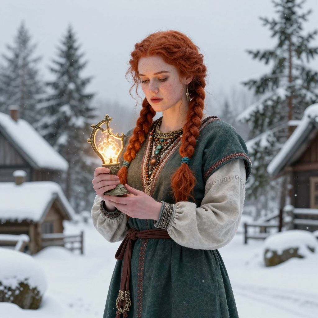Redhead Viking maiden in traditional Nordic dress, standing in snowy village, vivid red hair braided with beads, holding a glowing ancient artifact, surrounded by snow-covered pine trees