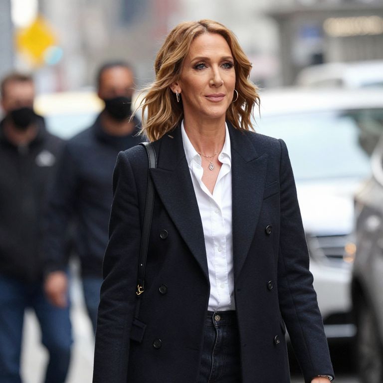 Photograph of a confident, middle-aged Caucasian woman with wavy, shoulder-length, light brown hair. She is wearing a black double-breasted coat over a white button-up shirt, paired with high-waisted dark jeans. She has a slender build and is smiling subtly. She carries a black shoulder bag and has small, dangling earrings. The background is a blurred urban street scene with people in black clothing, white vehicles, and city lights, suggesting a busy city environment. The overall mood is professional and poised.