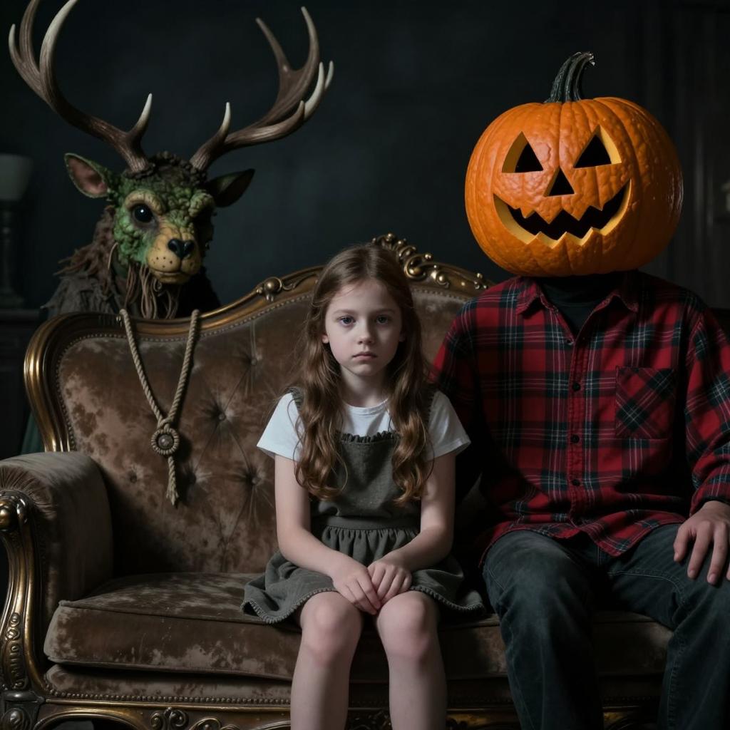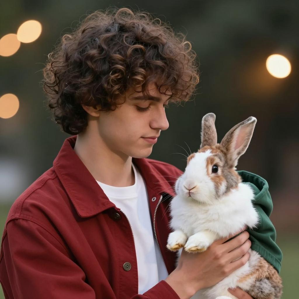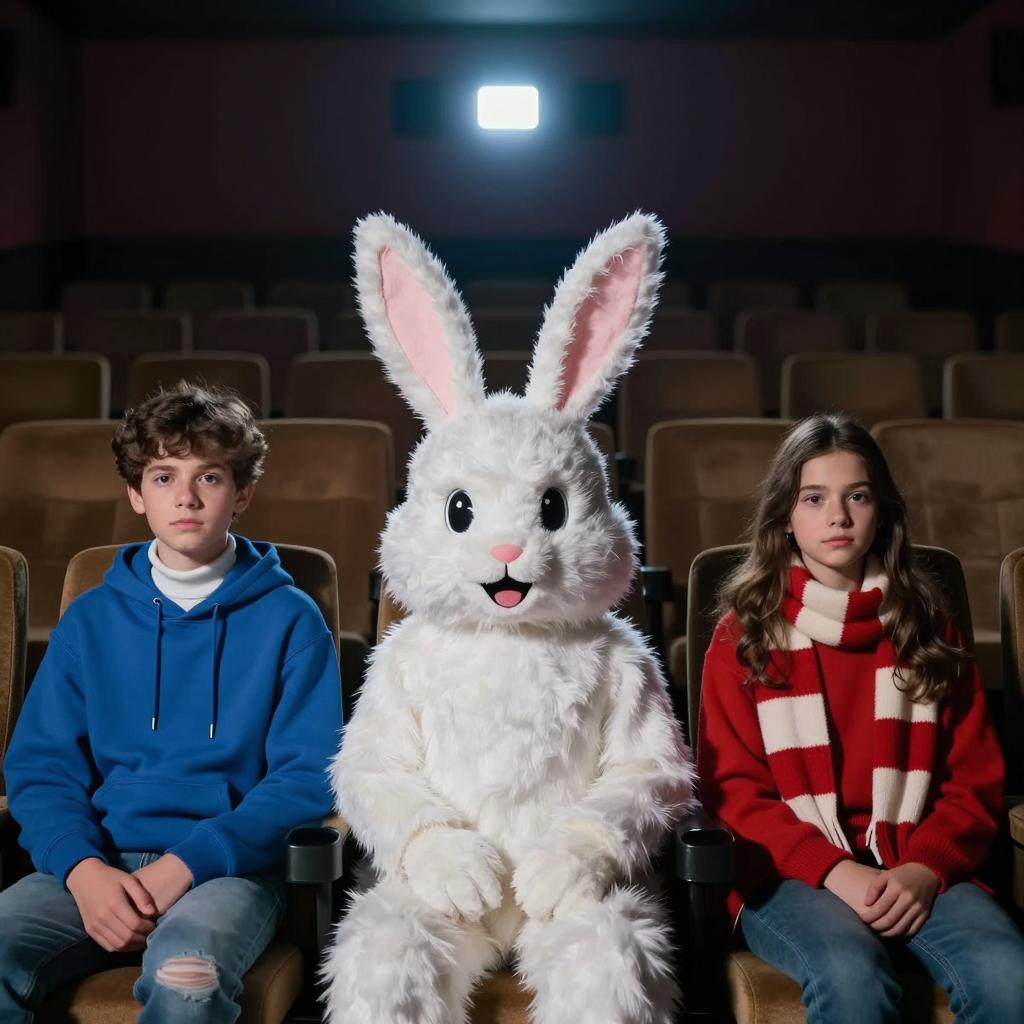 A dimly lit movie theater. Two people sit in the foreground. A boy with short brown hair, wearing a blue hoodie over a white turtleneck, sits on the left. A girl with long brown hair, wearing a red and white scarf, sits to the right. Both have neutral expressions. In front of them is a furry, white, anthropomorphic rabbit costume with large ears and a smiling mouth. The background shows empty rows of seats and a faintly illuminated stage area.