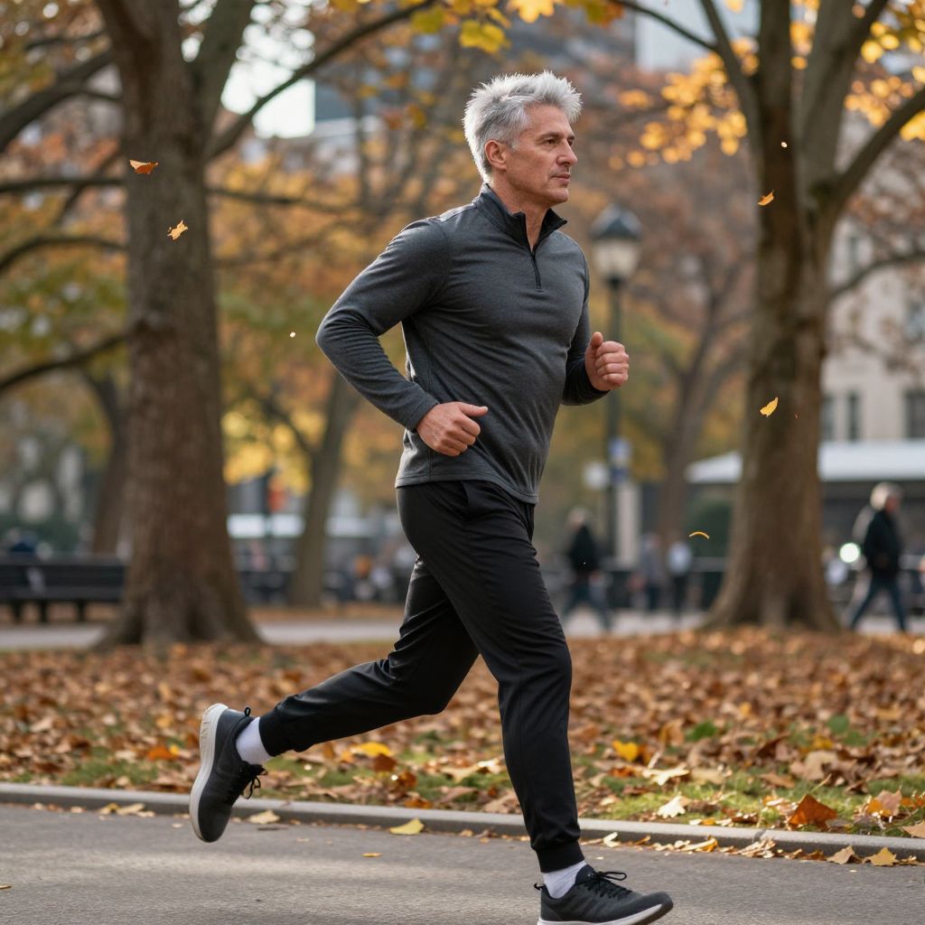 Photograph of a muscular man with silver hair jogging in a black long-sleeve shirt and pants, autumn park background.