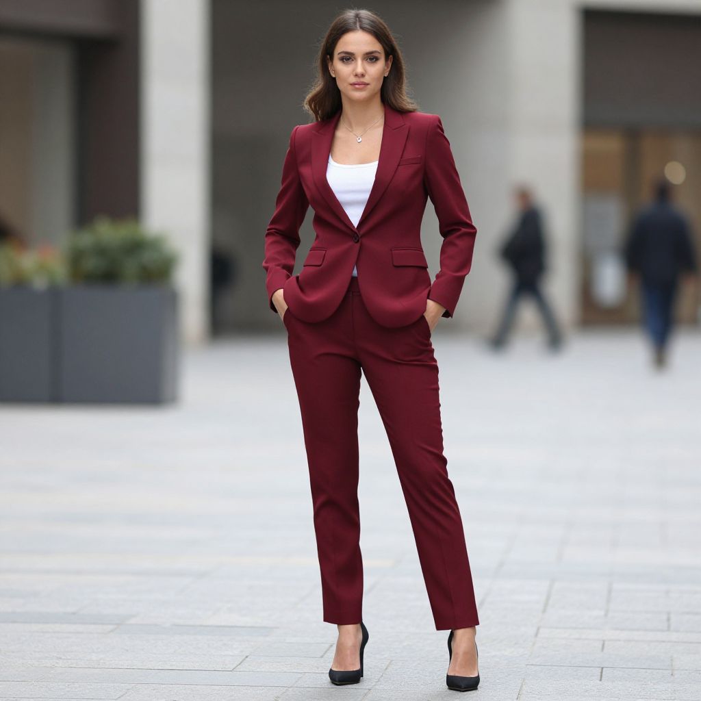 Burgundy pants suit woman, 1girl, solo, suit, formal, brown hair, hands in pockets, long hair, high heels, pants, jacket, outdoors, full body, red suit, standing, realistic, red pants, blurry, blurry background
