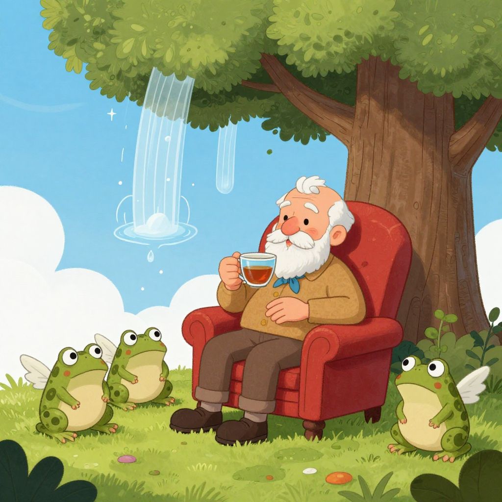 A colorful digital cartoon depicts an elderly man with a white beard and bald head, wearing an orange sweater, brown pants, and black shoes, sitting in a red armchair under a large tree. He holds a teacup, sipping tea. Surrounding him are four green frogs with yellow bellies, one with wings, against a bright blue sky with white clouds. A small, blue water fountain appears above the tree. The grass is lush and dotted with small flowers. The overall style is whimsical and playful.