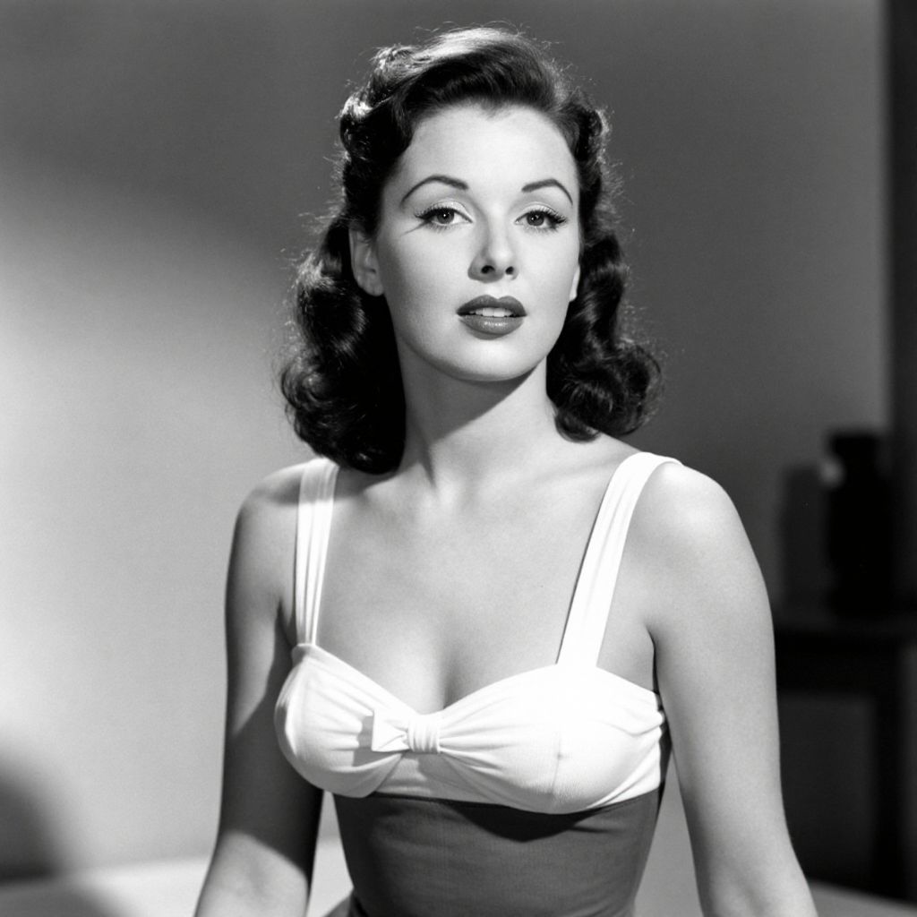 A vintage black-and-white publicity photograph featuring a woman in a stylish, retro swimsuit, showcasing dramatic lighting and classic Hollywood glamour reminiscent of 1940s cinema.