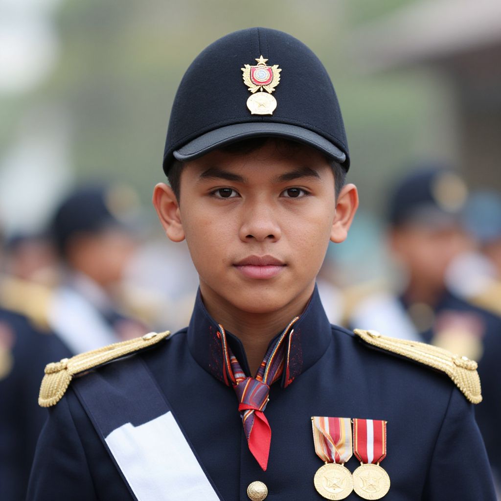 "costume philippines, solo, male focus, 1boy, hat, realistic, epaulettes, black hair, looking at viewer, upper body, scarf, blurry, uniform, blurry background, medal, jacket Realistic photo of casual sexy person with pretty face"