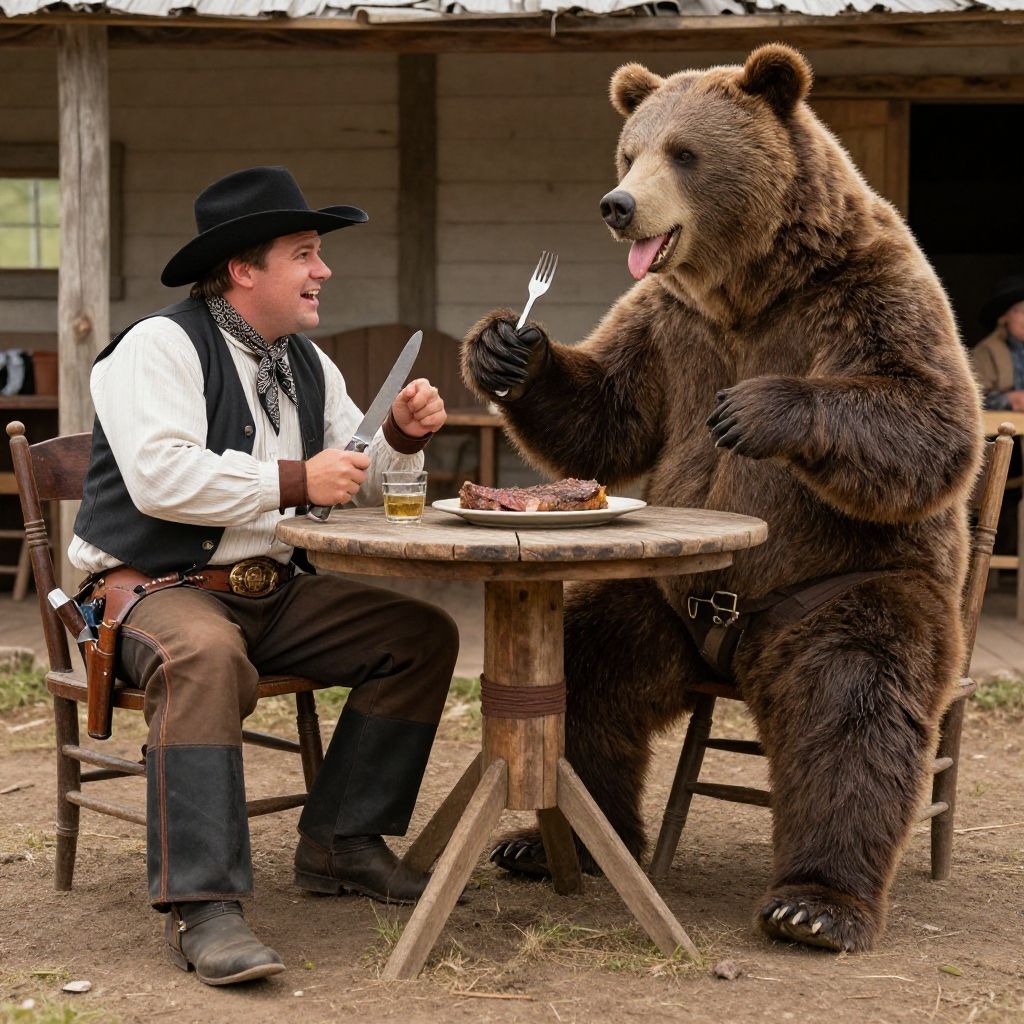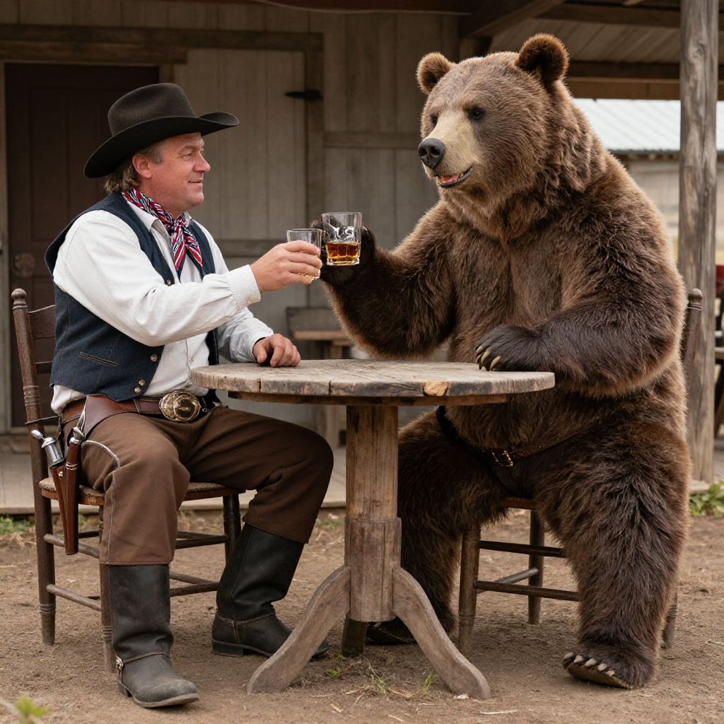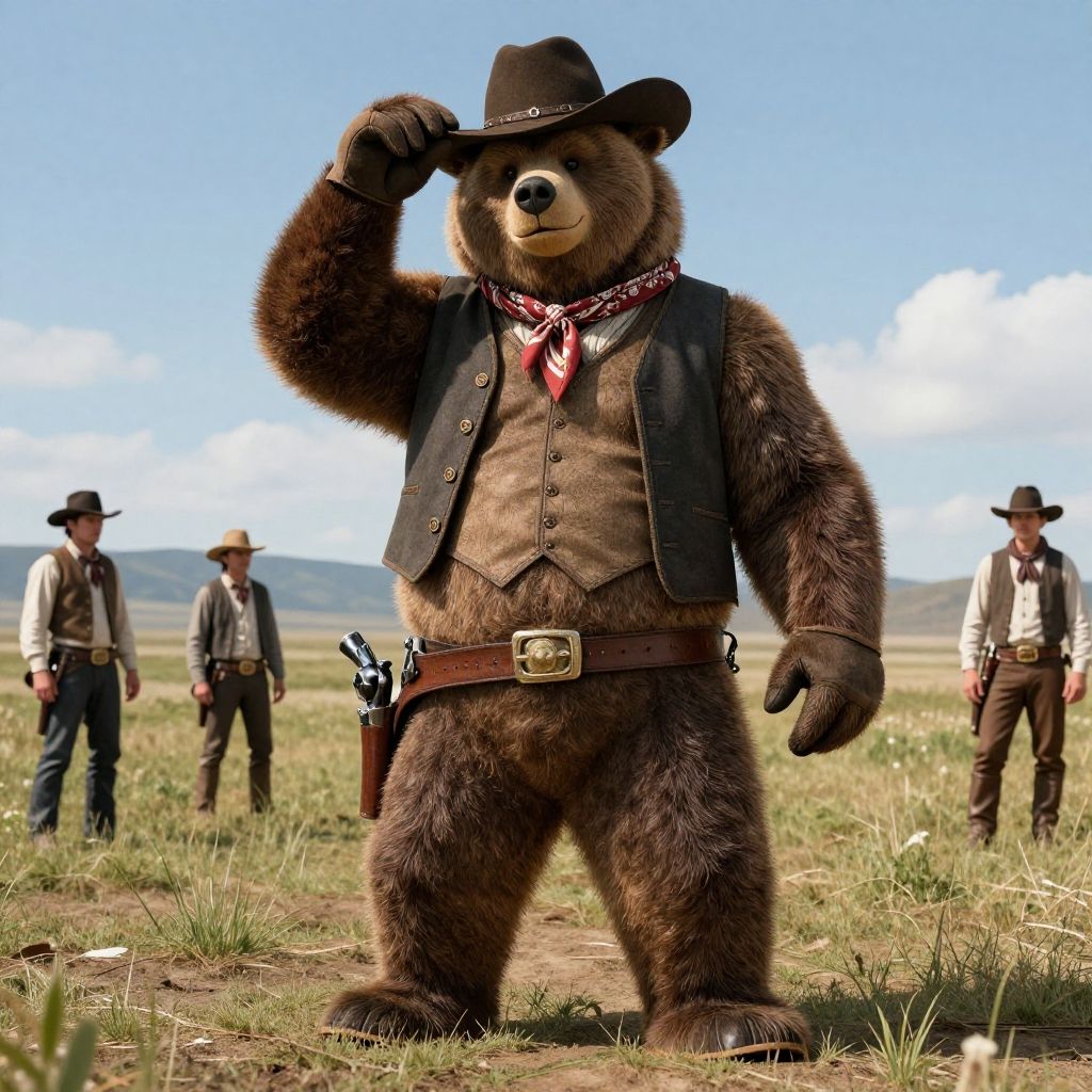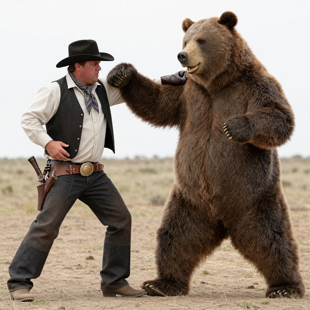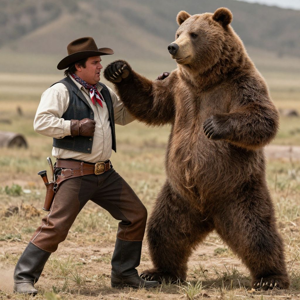 Masterpiece, best quality, high resolution, realistic hands, ultra-detailed, perfect lighting, vivid color, (multiple viewer:1.5), man's, Anthro, duo, wild west, The old west, western, (action pose, Fighting pose:1.5), (Buck viewer:1.5), grim face, and masterpiece, detailed body, man, (furry, Anthro:1.5), (bear's, brown bear, grizzly bear, plump, thick arms, short legs, thick legs, big body, long torso short legs:1.25), fat:1.35), (clothed, :1.5), (neckerchief:1.5), (cowboy wear, western wear:1.25), cowboy hat, vest, coat, pants, chaps, gloves, Boots, gun belt