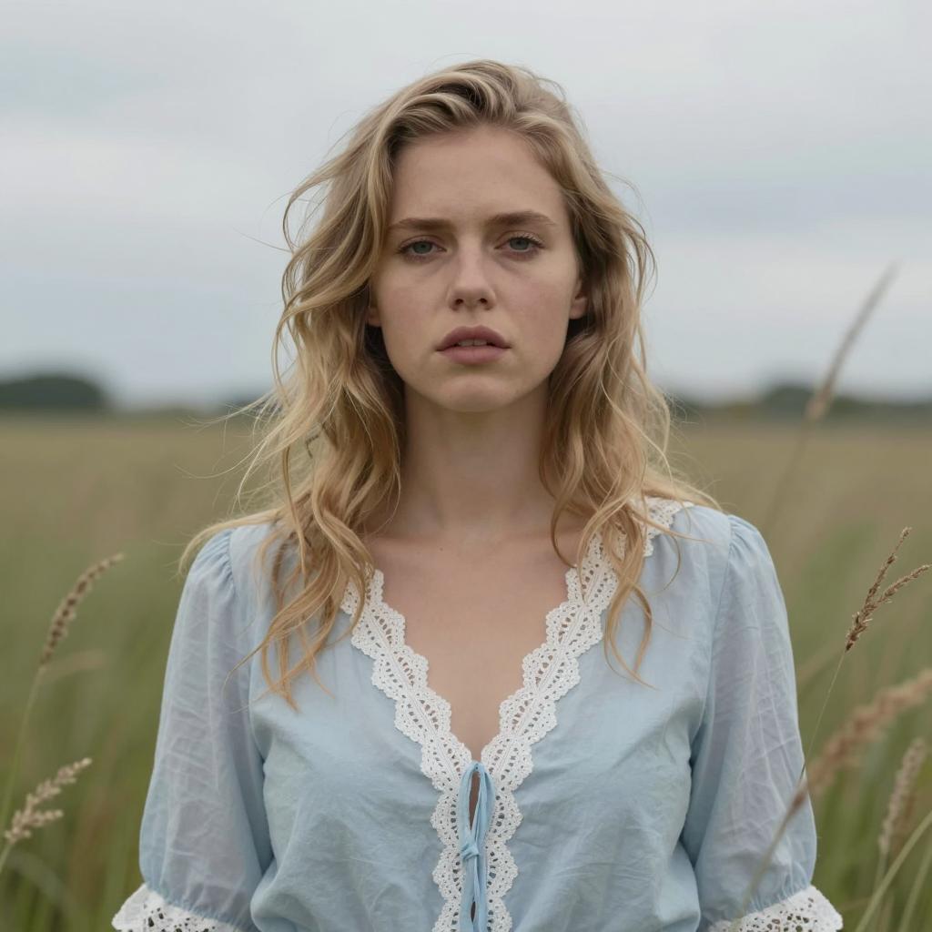 Woman with light blonde, wavy hair stands in tall grass, wearing a light blue blouse with white lace trim. Her expression is serious, with slightly parted lips. Overcast sky in the background. Tall grass blades in foreground. One person.