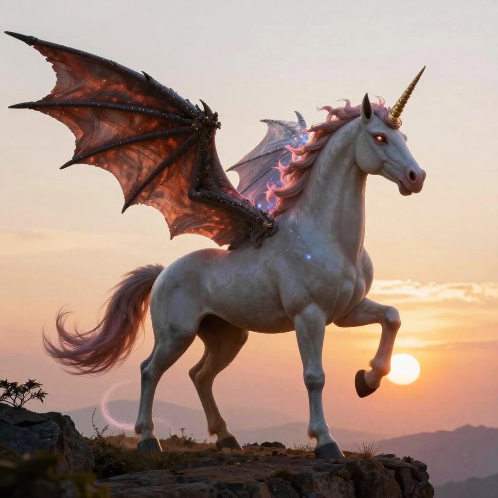 Dragon unicorn hybrid standing on a cliff at sunset, blending features of fierce dragon wings and a graceful unicorn body, with glowing eyes and magical aura, detailed fantasy illustration, vibrant and dynamic composition.