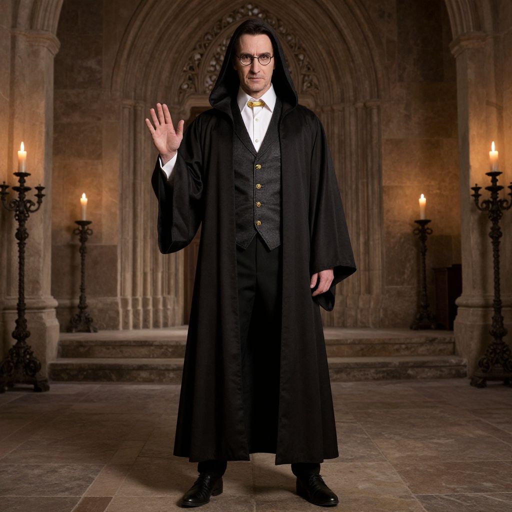 Photograph of a pale-skinned man with dark hair and glasses, wearing a black wizard robe over a white shirt, black vest, and black pants, standing in a dimly lit Gothic-style stone hall with arched windows. He has a yellow bow tie and is waving with his right hand. The background features tall, ornate candelabras with lit candles. The floor is made of stone tiles, and the overall atmosphere is dark and mysterious, with warm, flickering candlelight adding a dramatic effect. The man's expression is neutral.