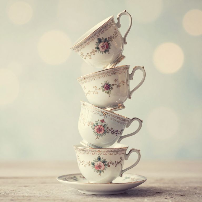 A whimsical stack of ornate teacups, each delicately balanced upside-down atop one another, creates a magical illusion of growth and defiance against gravity, rendered in a soft, vintage-inspired style with a dreamy bokeh background.