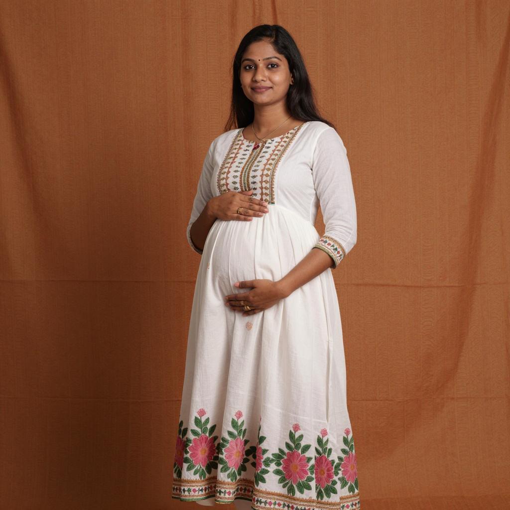 Portrait of a pregnant Indian woman with long dark hair wearing a traditional white dress featuring green and pink floral embroidery. She gently cradles her belly while standing against an orange patterned fabric background. The image captures a calm and relaxed atmosphere with soft natural lighting, showcasing traditional Indian cultural attire.