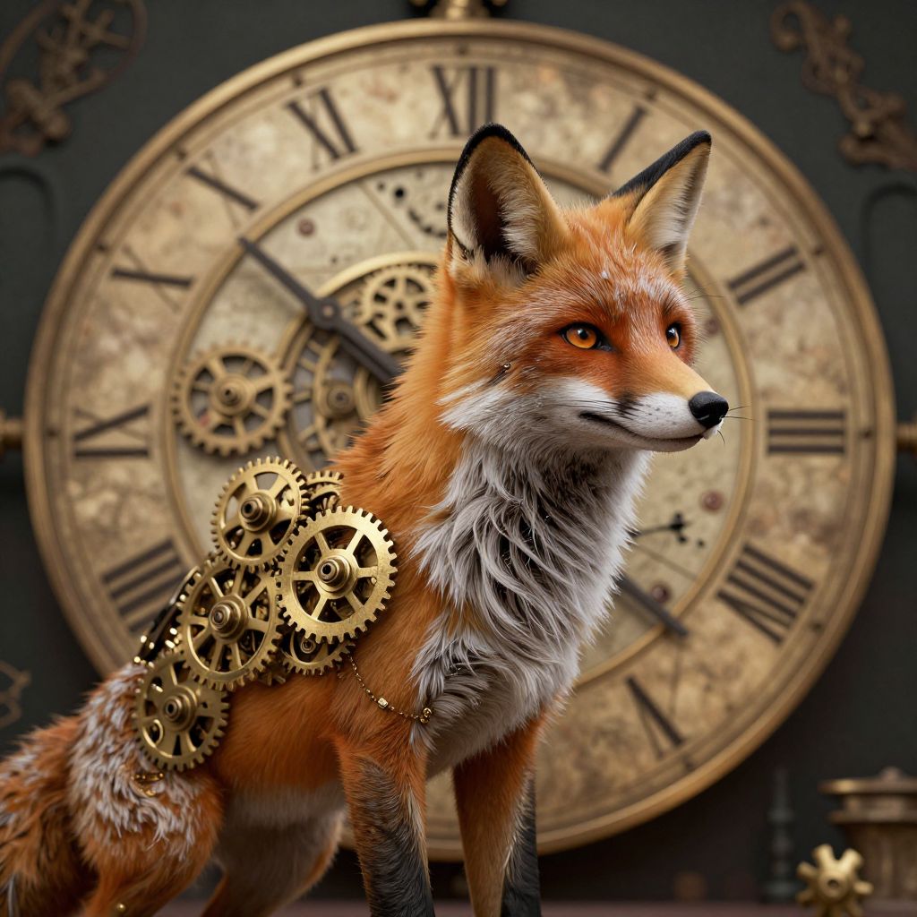 A clockwork fox made entirely of pulsating honey stands guard over a garden of crystallized time, each flower frozen in a different hour.