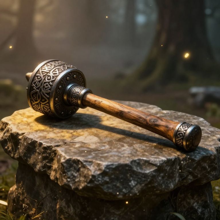 Ancient pernach mace lying on a stone pedestal, ornate iron flanges with intricate Slavic patterns, surrounded by ambient golden light, worn wooden handle, fantasy medieval scene, misty forest in the background with subtle glowing effects.