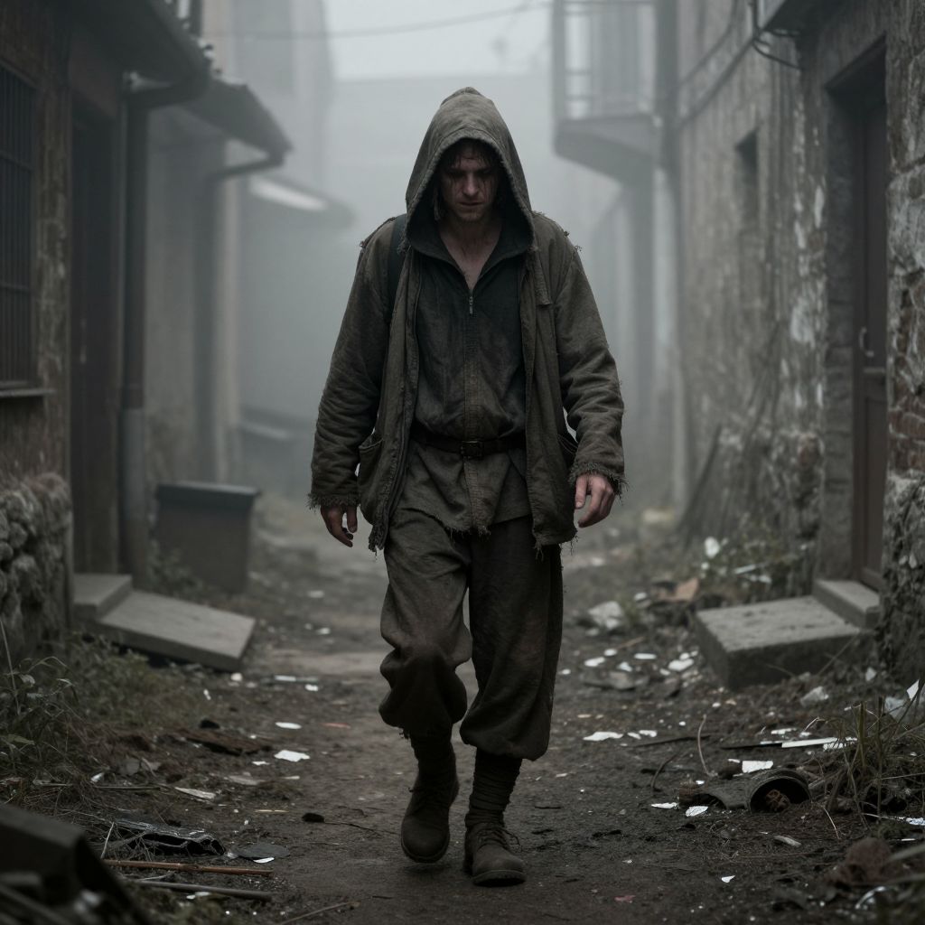 Photograph of a hooded, grimy man in dark, heavy clothing walking down a foggy, litter-strewn, abandoned alley with dil