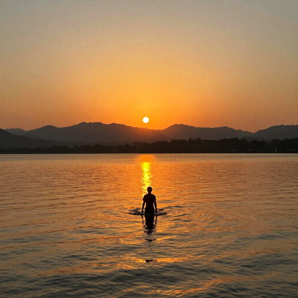 Photograph of a serene sunset over a calm lake. A solitary figure stands in the water, casting a reflection on the surface. The sun is low on the horizon, glowing orange and casting a warm light across the scene. Silhouetted mountains form the backdrop. The water is smooth, with gentle ripples radiating from the figure. The sky transitions from bright orange near the sun to a darker orange and gray higher up.