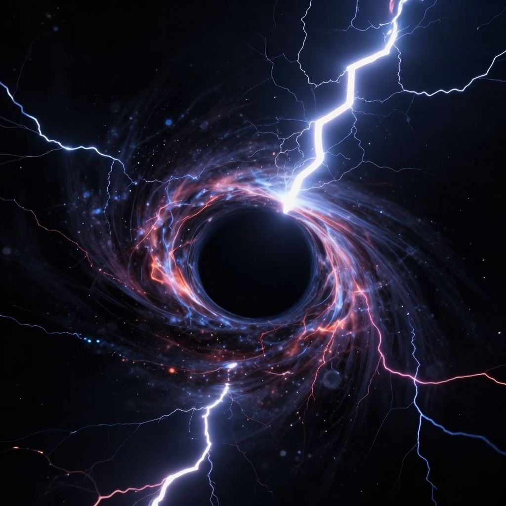 Digital artwork of a black cosmic vortex surrounded by vibrant lightning bolts in blue, pink, and white against a dark, starry background.