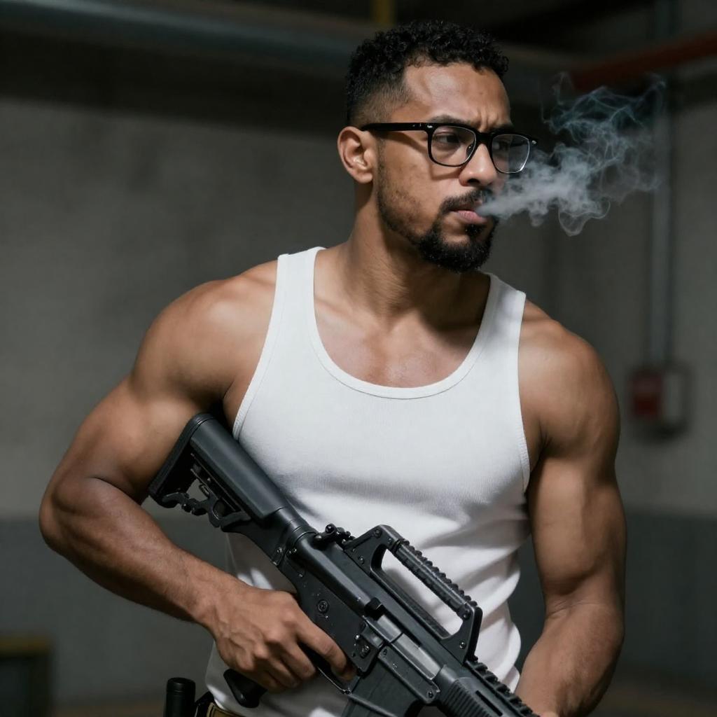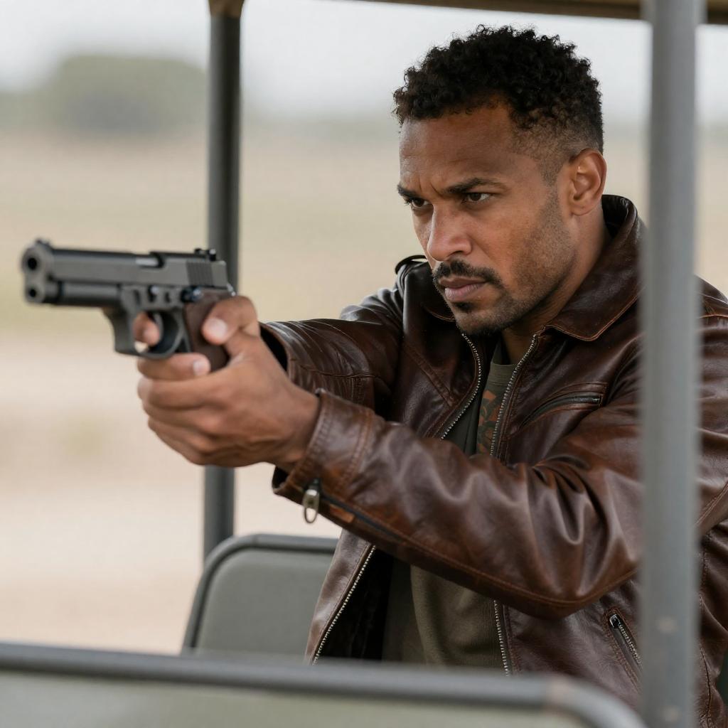 Photograph of a man with dark skin and short curly hair, wearing a brown leather jacket, holding a gray gun with his right hand, aiming it to the left. He has a tattoo on his chest. He is sitting inside a vehicle with metal poles and a blurry background. His facial expression is intense and focused.