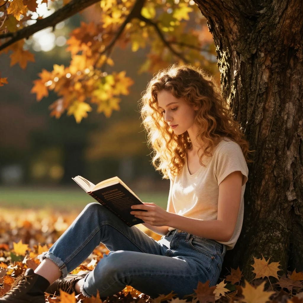 Blonde tween with freckles sitting on a park bench reading a book, early autumn setting, warm golden light, casual clothing, realistic style, shallow depth of field