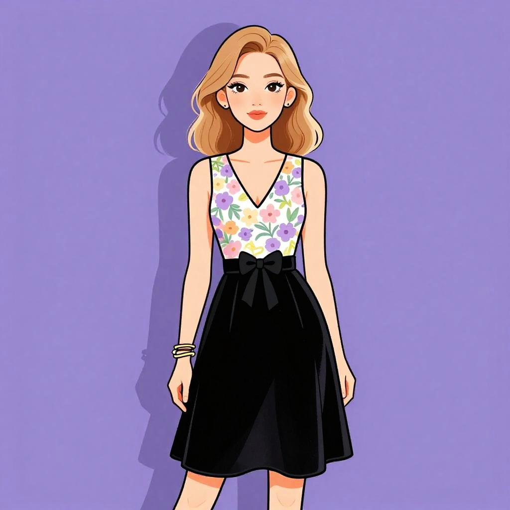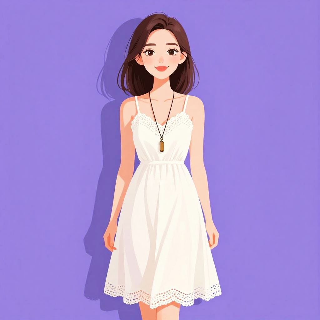 Woman with pretty face and pretty hair. Woman, retro-inspired, yellow dress with small white floral print, knee-length, Peter Pan collar with lace trim, three-quarter sleeves, white cuffs, subtle A-line silhouette, scalloped white hemline, straight blonde hair, neutral makeup, white studio background --sref 1467