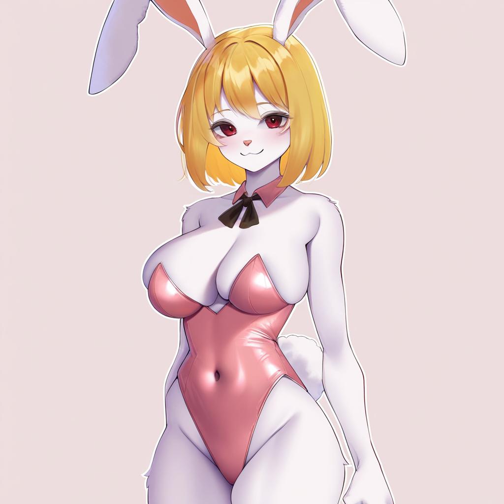 Digital artwork of a furry female character with rabbit features including white fur, large rabbit ears, and a fluffy tail. She has short blonde hair, red eyes, and a small animal-like nose. The character is dressed in a shiny, pink, form-fitting bunny suit with a black bow tie and collar. The style is inspired by anime and furry art aesthetics.