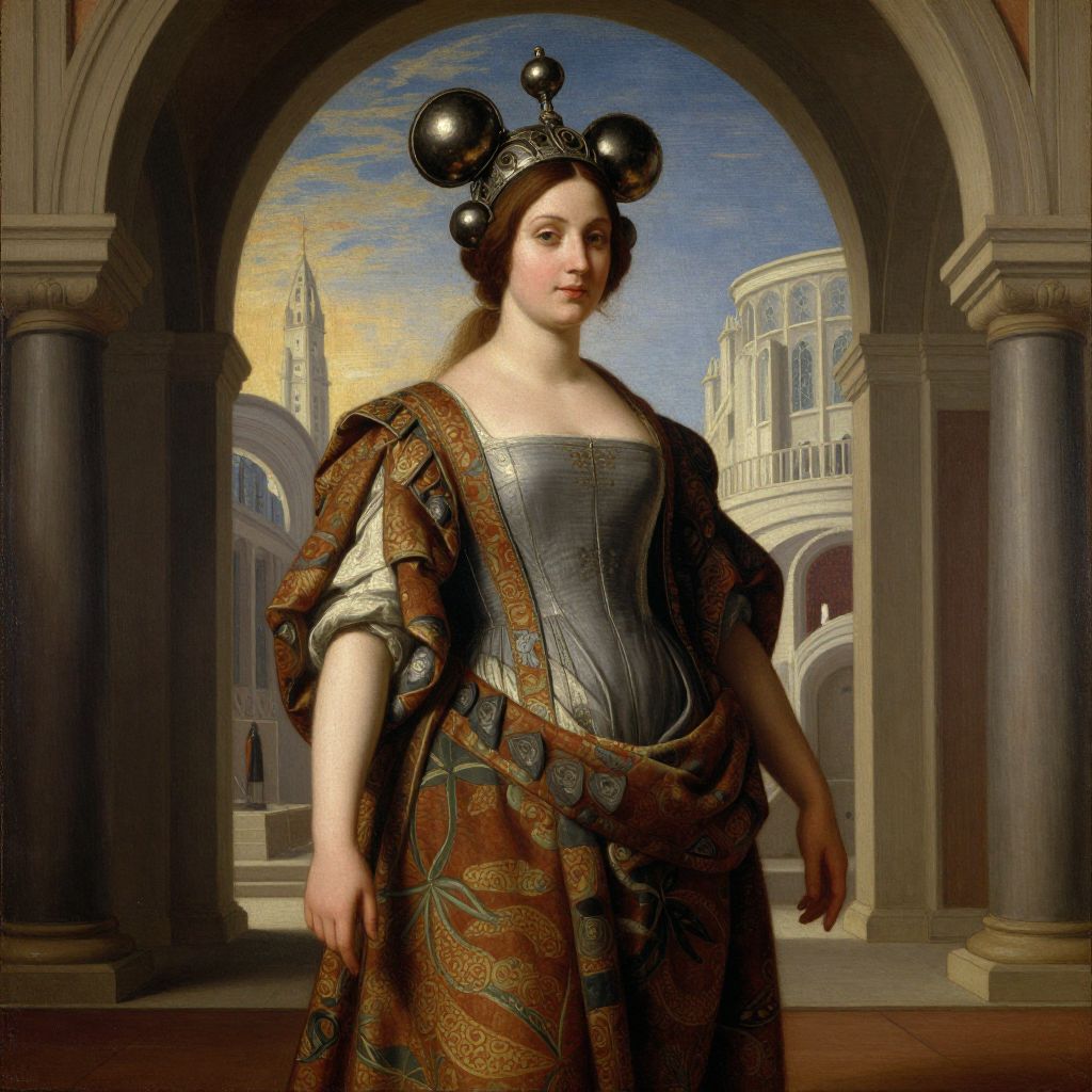 The image depicts a woman in a futuristic, renaissance-inspired setting, reminiscent of classical oil paintings by Titian. She is adorned with an elaborate headpiece featuring large, bulbous ornaments, and wears a flowing, patterned robe over a simple, square-necked dress. The background is a blend of classical architecture and futuristic elements, with arches and columns that evoke a sense of grandeur and timelessness. The color palette is rich and warm, with earthy tones and metallic accents that add depth and texture to the scene. The overall composition is balanced, with the woman centrally positioned and the architectural elements framing her figure, creating a harmonious and visually engaging image that seamlessly blends historical and futuristic aesthetics.
