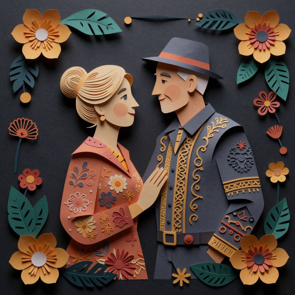 The image depicts an elderly couple in a vibrant, 3D paper art illustration, rendered with intricate details and dramatic lighting. The couple, composed of a woman with a bun and a man wearing a hat, are positioned closely, facing each other with a sense of intimacy. The woman's attire features a floral pattern, while the man's clothing is adorned with ornate designs, both illuminated by volumetric lighting that casts dramatic shadows and highlights their textures. The background is a dark, cinematic setting, punctuated by an array of colorful, paper-cut flowers and leaves that frame the couple, adding depth and a sense of dimension to the scene. The overall composition is balanced, with the couple centrally aligned, and the intricate paper art elements surrounding them, creating a harmonious and visually striking image.
