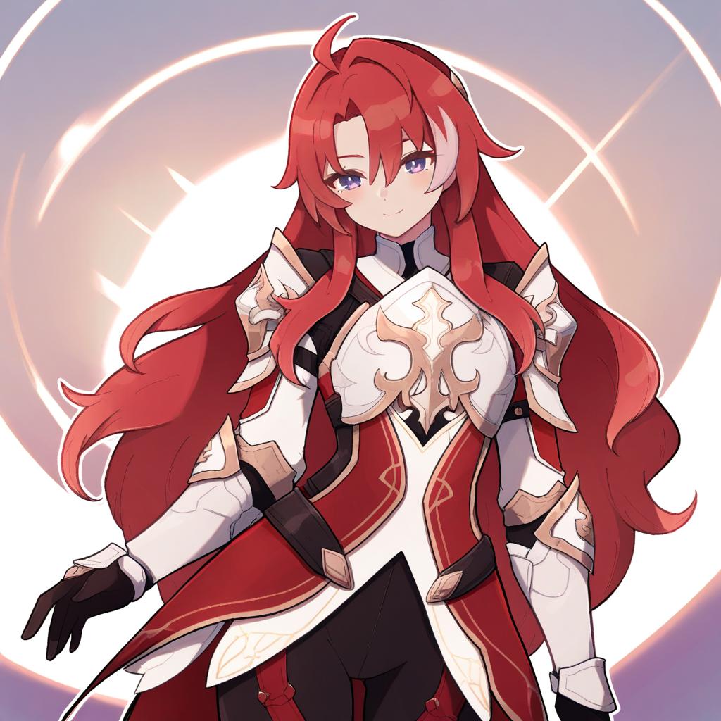 Argenti (honkai: star rail), honkai: star rail, 1boy, green eyes, hair between eyes, red hair, long hair, curtained hair, streaked hair, ahoge, parted bangs, white armor, knight, gauntlets, knight, pauldrons, breastplate, by artist lamb-oic029, animagine