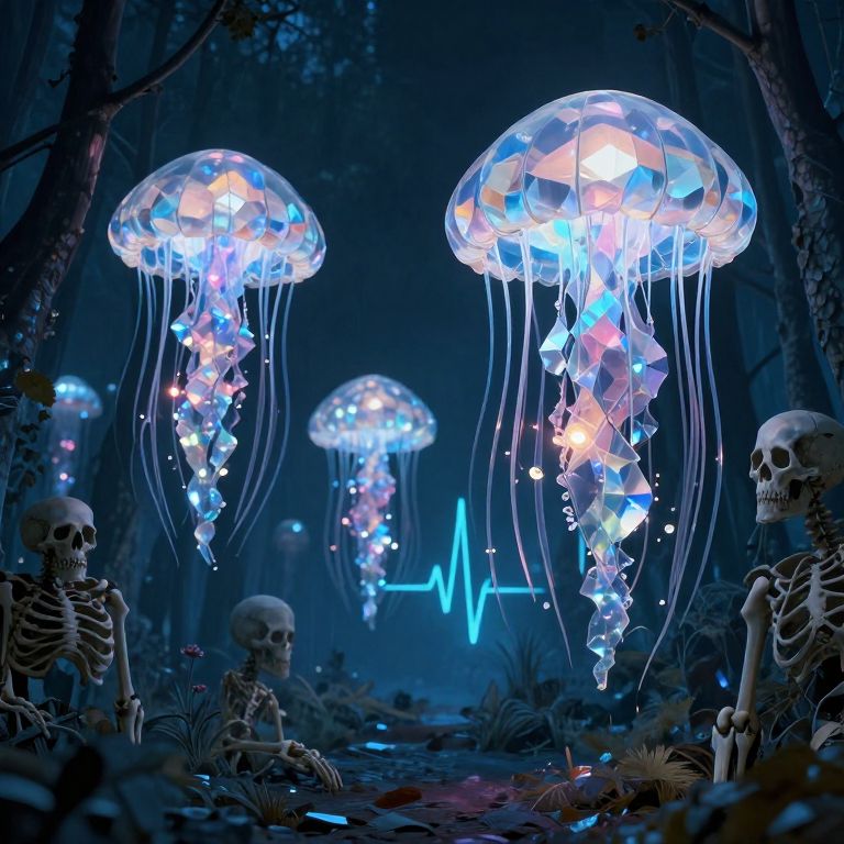 Photograph of glowing jellyfish with blue and white lights, surrounded by skeletal figures in a dark, eerie forest at night.