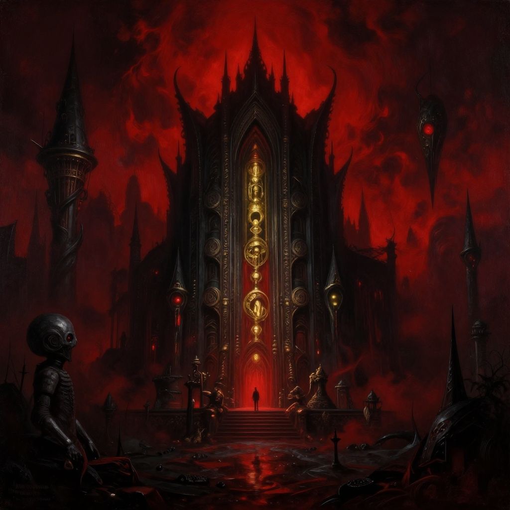 Digital artwork of a dark, gothic cathedral with glowing red eyes and golden runes, surrounded by shadowy figures and eerie red smoke.