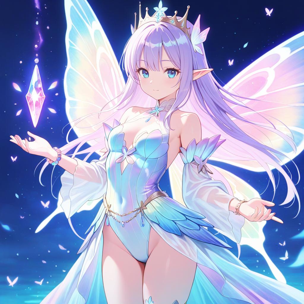 Anime style, fantasy theme, beautiful fairy girl, long lavender hair, blue eyes, butterfly wings, elf ears, crown, glowing jewelry, pastel colors, highly detailed, diaphanous wrap with iridescent beads, dreamy whimsy and vibrant energy, tranquil oasis amidst singing crystal streams, luminous twilight filled with pastel hues