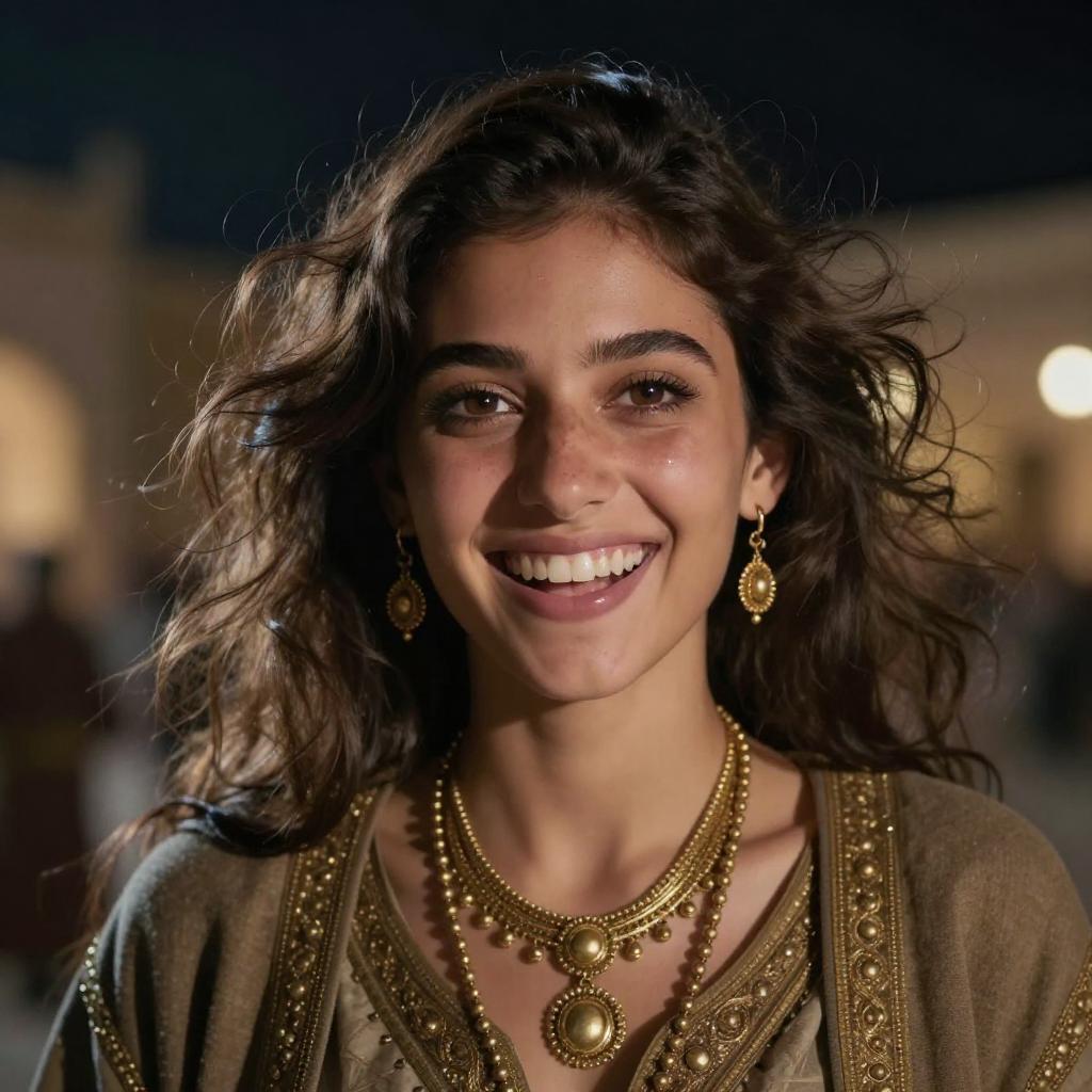 Photograph of a young woman with wavy, dark brown hair and medium skin tone. She is smiling widely, showing white teeth, and wearing gold, ornate jewelry including dangling earrings, a necklace with a central oval pendant, and a detailed, embroidered top. The background is dark and blurred, with soft, warm light sources creating a nighttime street scene ambiance. Her face is illuminated, highlighting her clear complexion and expressive eyes. The overall style is reminiscent of a Renaissance or bohemian fashion.