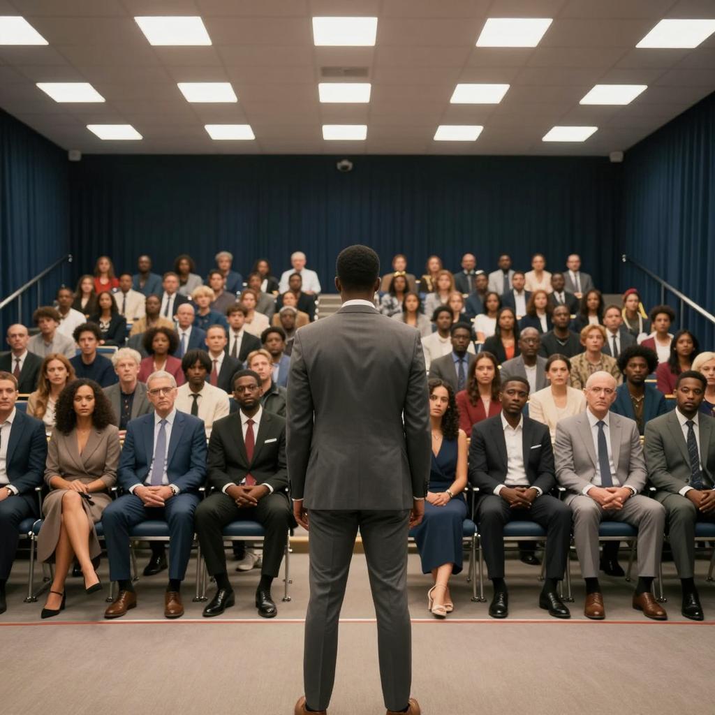 A Black man in a gray suit stands at the front of a large auditorium, facing a diverse crowd seated in multiple rows. The audience includes men and women of various ethnicities wearing both formal and casual attire, with expressions ranging from attentive to bored. The room is brightly lit by overhead lights, featuring dark blue curtains and stairs in the background.