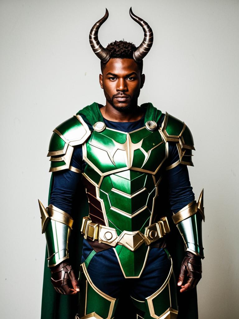 Photo-realistic full body portrait of a dark-skinned male cosplayer wearing a detailed green and gold power armor costume with a cape and large curved horns. The costume features intricate gold trim, armored gloves, and a belt, representing a superhero or fantasy character. The subject has short brown hair and a serious expression, standing against a plain white background.