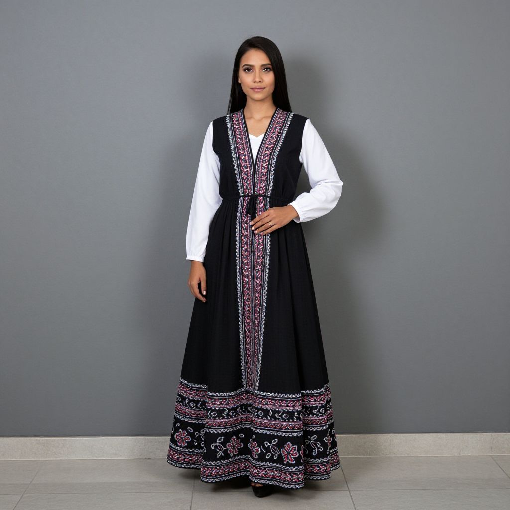 Photograph of a young South Asian woman with long black hair, standing against a plain gray wall. She wears a traditional black dress with intricate pink and white embroidery along the front, sleeves, and hem. The dress has a white long-sleeved blouse underneath. She stands with her right hand on her hip and left hand relaxed by her side. The floor is light gray tile. Her expression is neutral, and the lighting is even, highlighting the detailed embroidery on her dress.