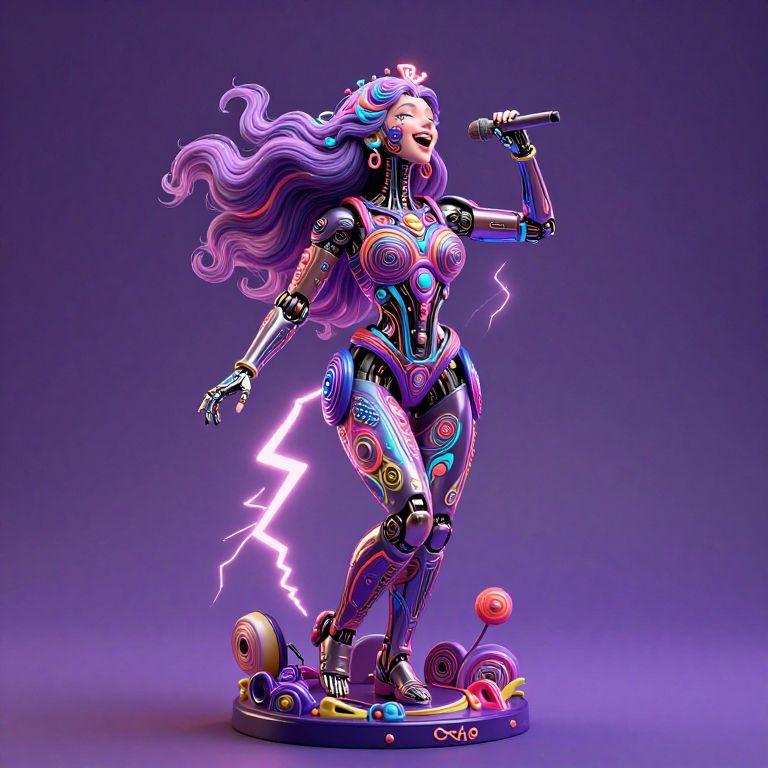 This is a digital CGI image of a vibrant, futuristic, robotic female singer. She has long, flowing purple and pink hair, and is holding a microphone in her right hand. Her body is covered in colorful, glowing patterns and circuits, with neon lights illuminating her form. She stands on a circular platform adorned with colorful buttons and gears. A bright purple lightning bolt emits from her left leg, adding a dynamic effect. The background is a gradient of deep purple, enhancing the vivid colors of the character. The overall style is reminiscent of neon, cyberpunk aesthetics.