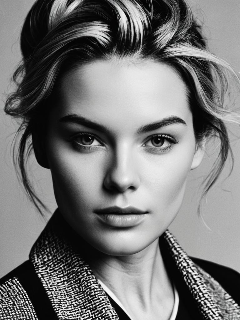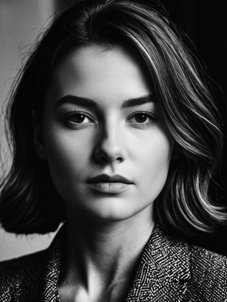 Woman in Designer Outfit, close-up detailed headshot, photorealistic realism