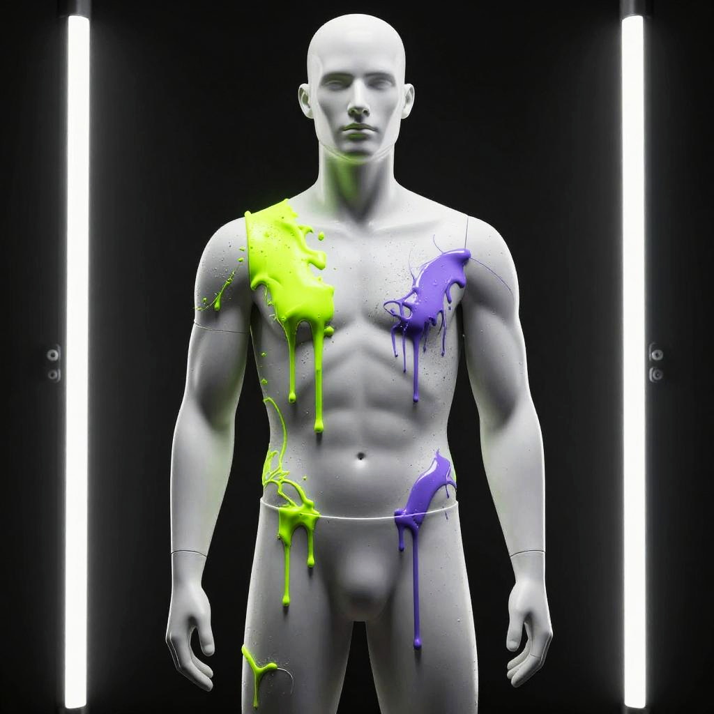 Realistic photo.White male mannequin covered in neon paint splatters, with wires cascading down, standing against black background with bright silver light, Octane Render, symmetrical composition, cyberpunk aesthetic, highly detailed, 32k super-resolution realistic photo