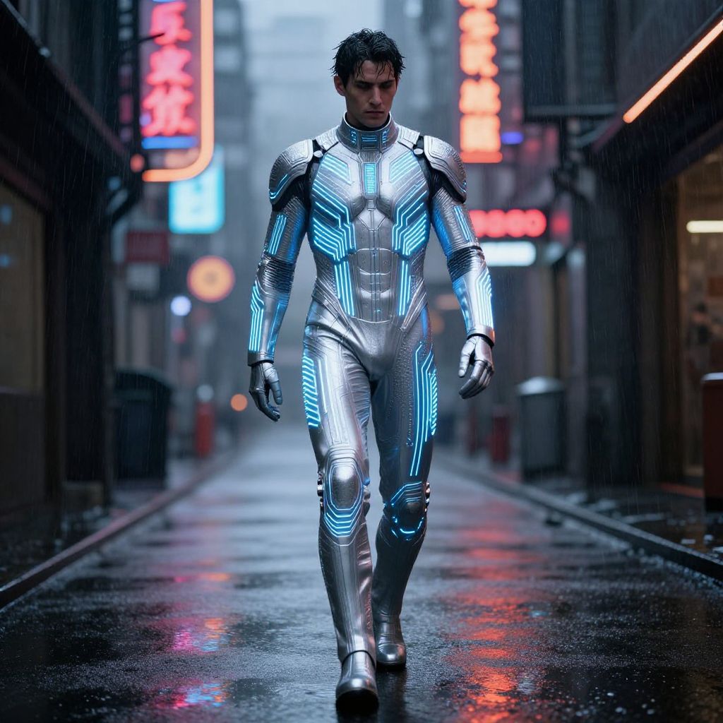 A futuristic silver suit with integrated glowing circuit patterns, a man walking through a rain-soaked cyberpunk alley, neon signs pulsing in the background, high contrast, dynamic lighting, Dall-E style.