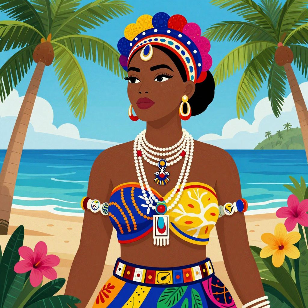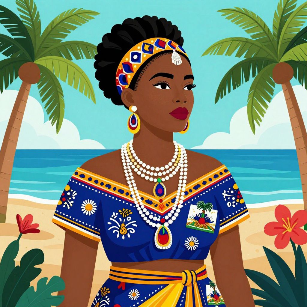 A vibrant digital illustration inspired by Haitian art, featuring a woman adorned in colorful traditional attire and jewelry, set against a tropical backdrop with palm trees, flowers, and a serene seascape, capturing the essence of Caribbean culture and creativity.