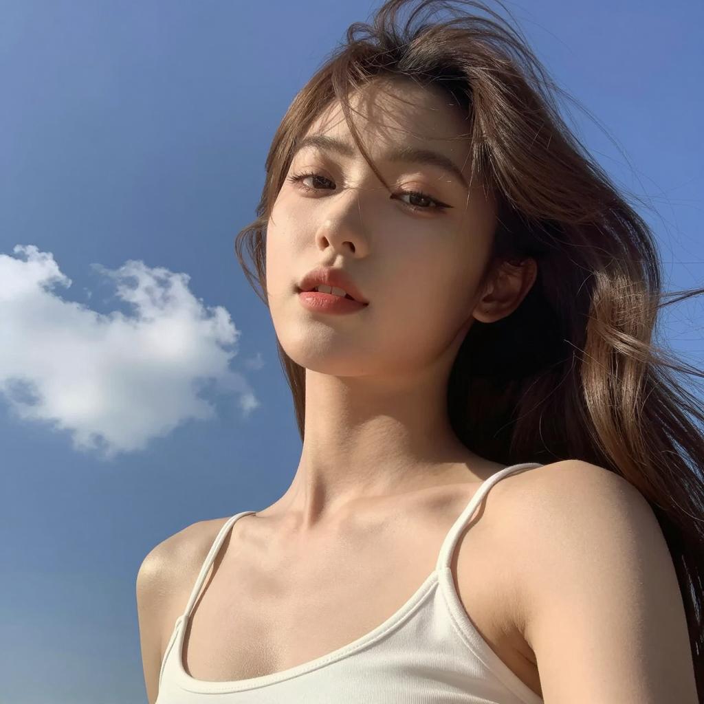 Young woman with long brown hair blowing in the wind, wearing a white spaghetti-strap top, against a bright blue sky with scattered white clouds. Her face is slightly tilted, eyes focused forward, lips slightly parted. Sunlight illuminates her skin. She has light makeup, with a subtle pink shade on her lips. Her right shoulder is more visible than her left. Her hair is wind-swept to the right. She is the only person in the image. The background is a clear sky. The image is a photograph.