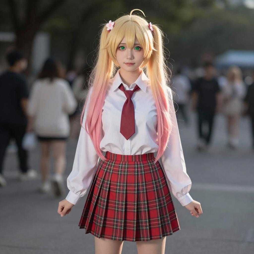 Photo-realistic cosplay photo of person standing in momosuzu nene (casual) costume. 1girl, fang, green eyes, blonde hair, official alternate hairstyle, gradient hair, pink hair, long hair, official alternate hair length, medium hair, twintails, hair flower, hairclip, red skirt, plaid skirt, pleated skirt, long sleeves, virtual youtuber, virtual youtuber, red neckerchief, miniskirtfull body shot. lifestyle stock photo, shallow depth of field, lifestyle stock photography, shallow depth of field, natural lighting, warm tones, soft background blur, vibrant colors, realistic textures, professional photoshoot