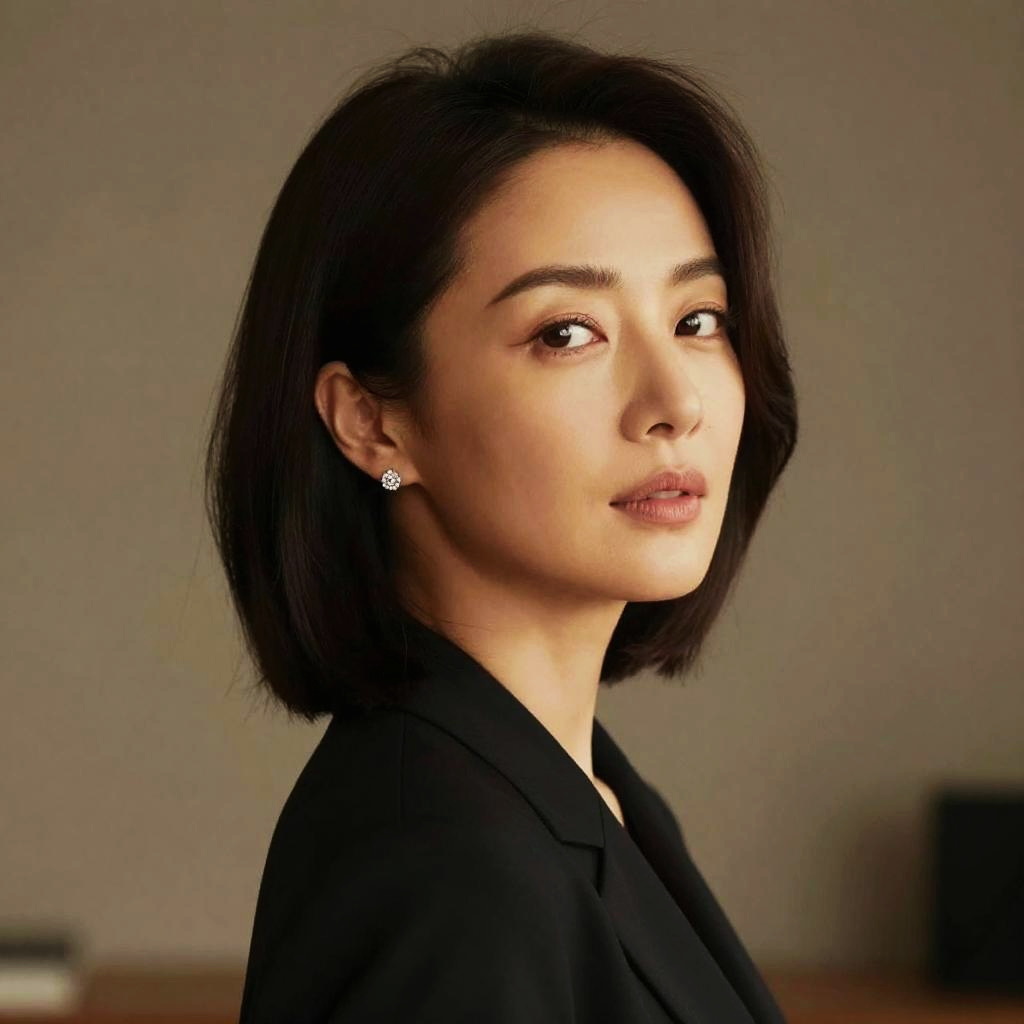 Modern Mullet hairstyle on middle-aged woman, wearing sleek leather coat, in modern office lobby, captured in fashion editorial style with cool ambient lighting.