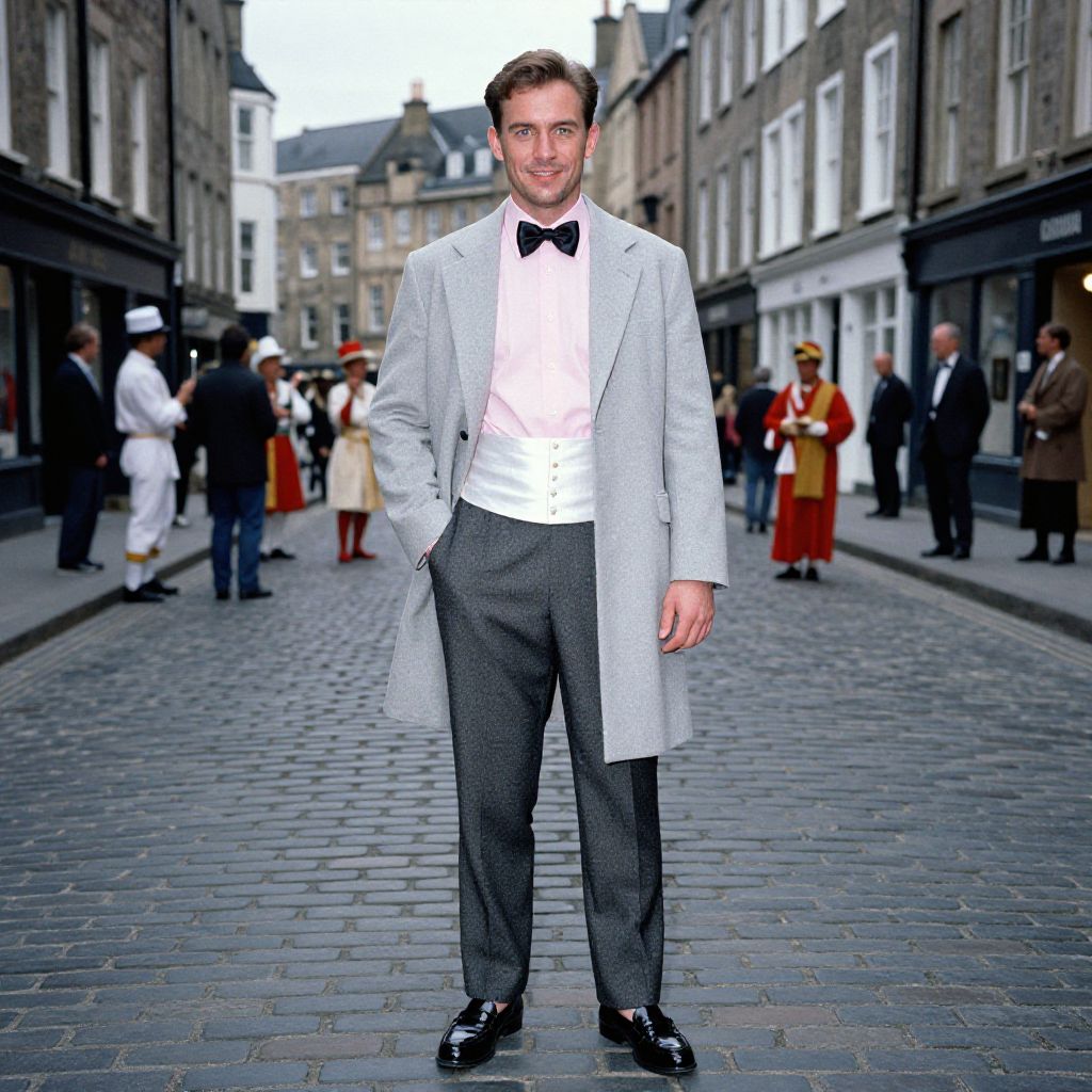 A man, light grey morning coat, pale pink dress shirt, white waistcoat, black satin bow tie, tailored charcoal trousers, shiny black loafers, historic cobblestone streets, charming old buildings, lively street performers, kodacolor analog film, confident smile. Man has masculine face and piercing eyes