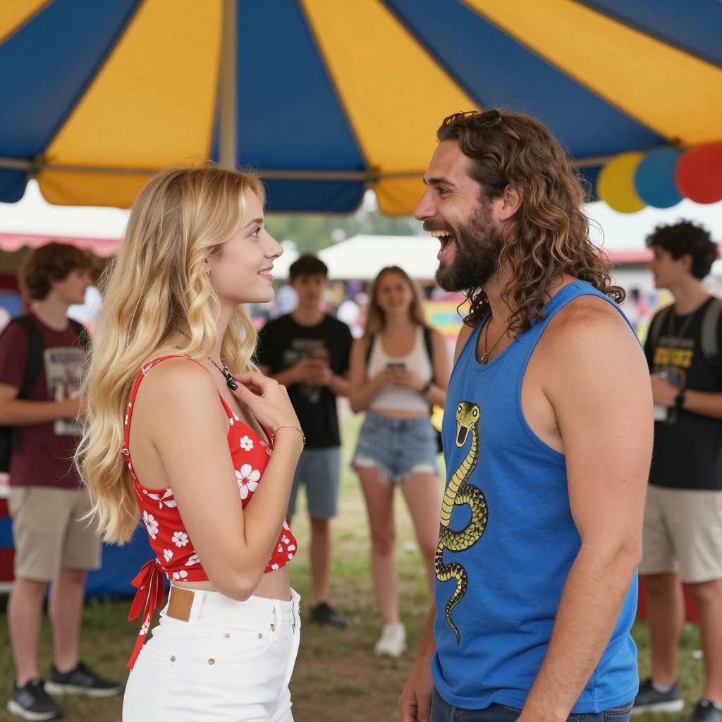 Photograph of a carnival scene. A man with long brown hair, beard, and a blue tank top with a serpent design stands facing a blonde woman with long hair, wearing a red floral crop top and white pants. They are under a yellow and blue striped tent with balloons and other people in the background. The man has a wide, open-mouthed smile, and the woman touches her chest. Five other people are visible in the background.