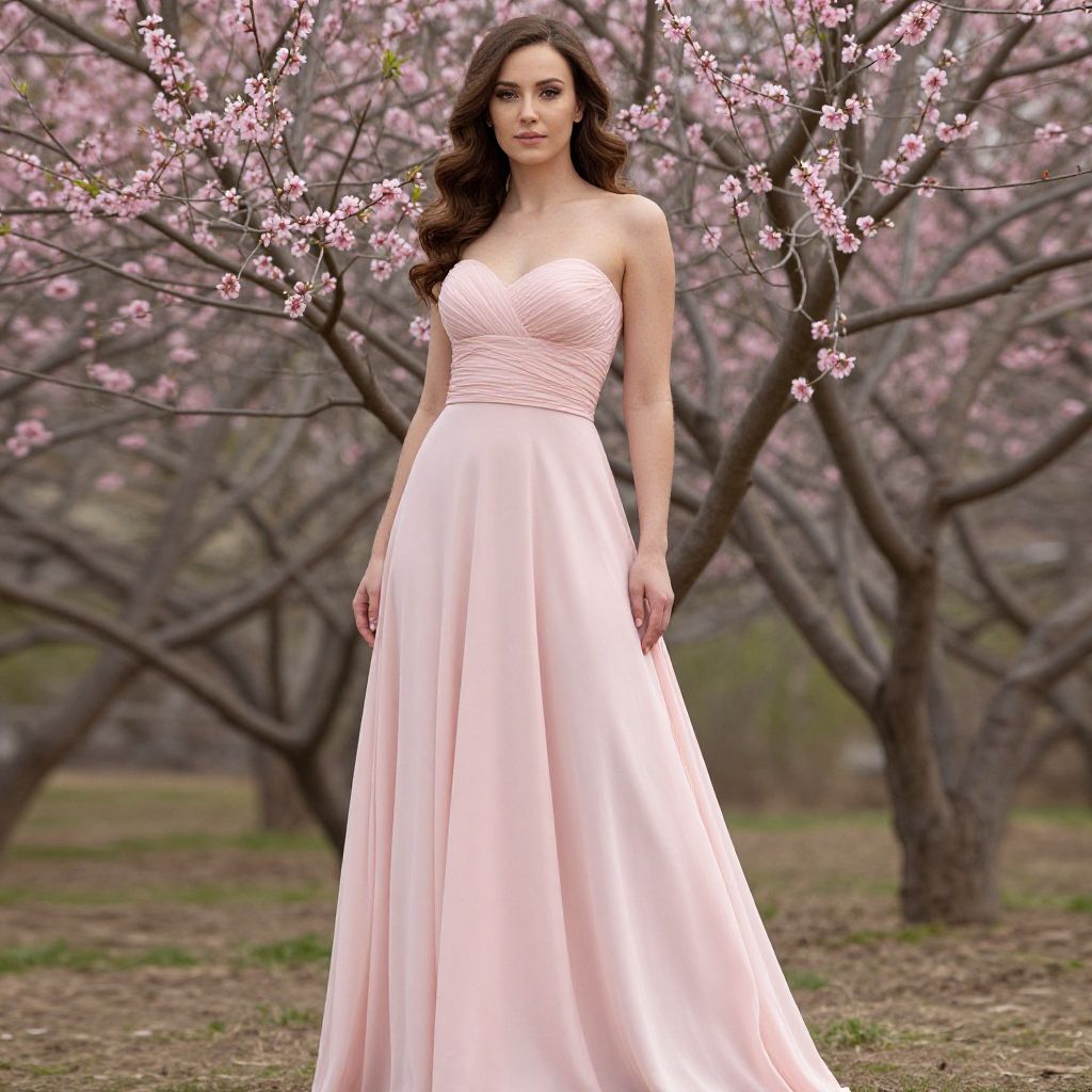 Photograph of a beautiful woman with long, wavy brown hair standing in a blooming cherry blossom orchard. She wears a strapless, light pink satin gown with a fitted bodice and a flowing, floor-length skirt. The background features pink cherry blossoms on dark branches, with a grassy, slightly blurred orchard floor. The woman's makeup is subtle, accentuating her natural beauty, and she gazes confidently at the camera. The soft lighting enhances the gentle pink hues of the dress and blossoms, creating a serene, elegant atmosphere.
