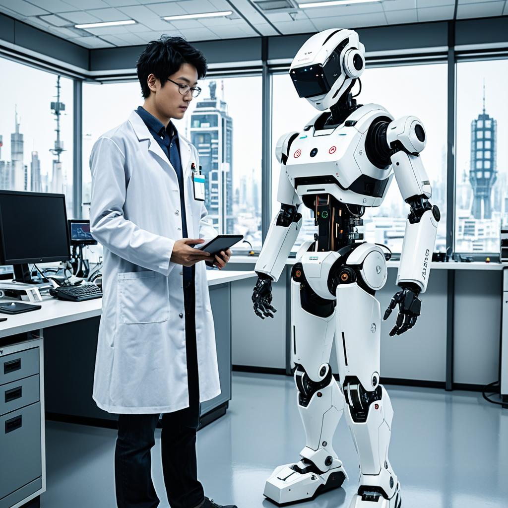 An innovative Asian robotics engineer wearing a white lab coat and glasses stands next to a sleek, white experimental android with articulate limbs in a high-tech laboratory. The lab features large windows with a view of a futuristic metropolis skyline. The scene highlights advanced robotics and cutting-edge technology in a modern research environment.