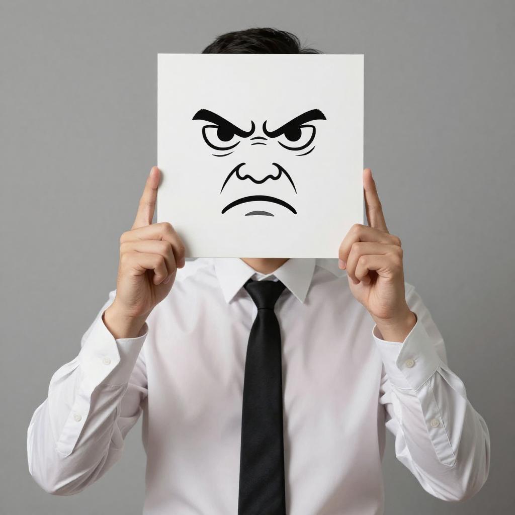 Photograph of a man wearing a black suit and white shirt, holding a white square with a black smiley face mask over his head. The background is a plain, gray textured wall, slightly blurred. The lighting is even, with no harsh shadows. The camera angle is straight-on, and the depth of field keeps the man's hands and face mask in sharp focus while the background is softly blurred.