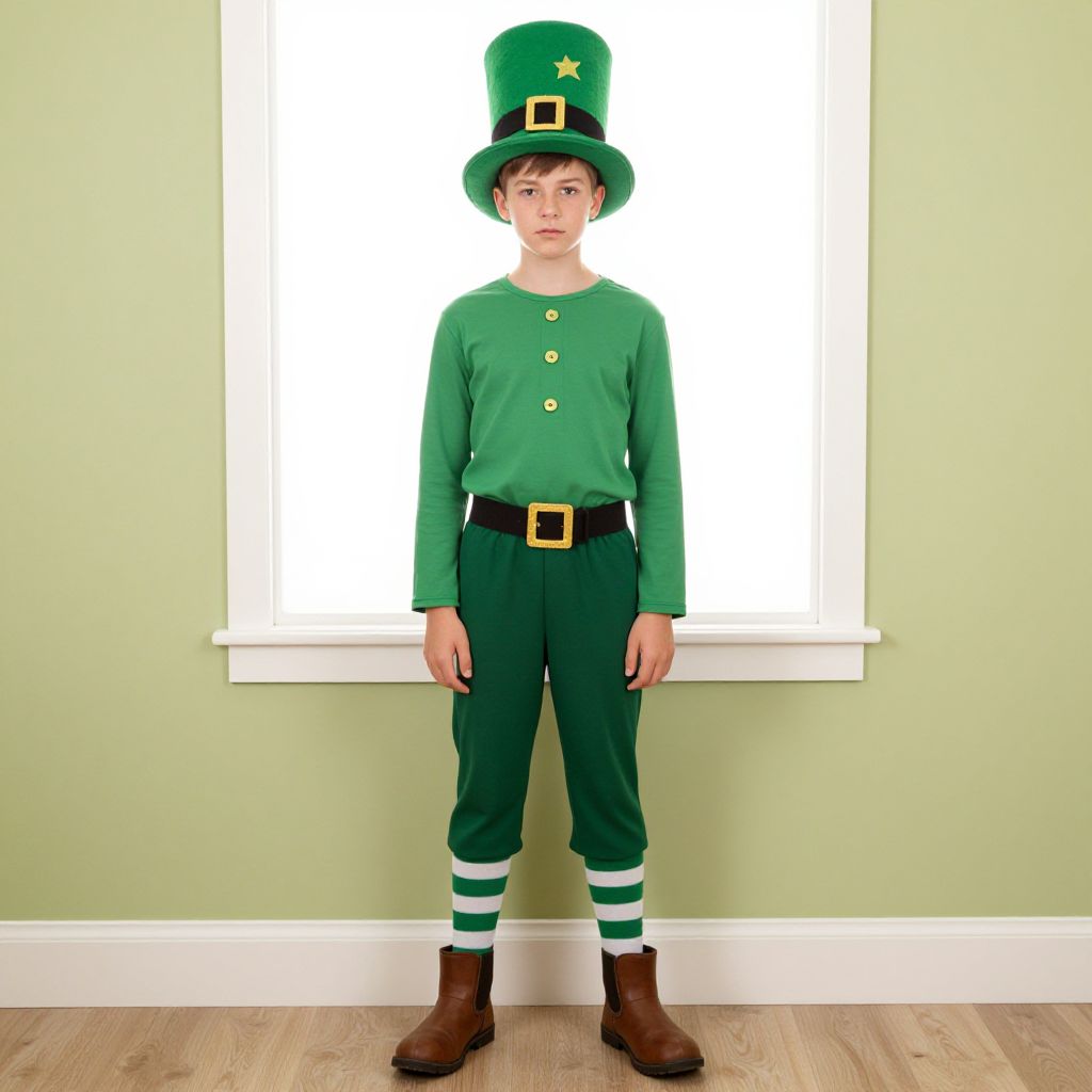 Photograph of a young boy in a green leprechaun outfit with tall hat, black belt, striped socks, and brown boots, standing in